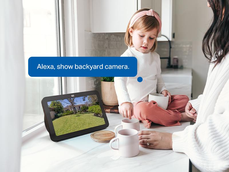 Mount the camera on walls, ceilings, desks, or poles. Use sound/light alarms to deter intruders. The package includes mounting bracket, template, anchors, screws, power adapter, USB cable, and quick start guide. Dimensions: 4.15 × 3.06 × 2.75 in. Weight: 7.76 oz. Compatible with Alexa, Google Assistant, and Samsung Bixby.