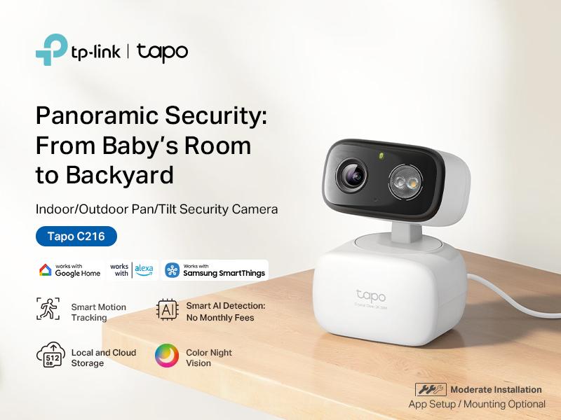 Tp-Link&Tapo C216 2K Pan/Tilt Indoor/Outdoor Security Camera AI Person/Baby Cry Detect, Motion Tracking, Color Night Vision, 360° Pan/Tilt, No Subscription, Works W/Alexa & Google